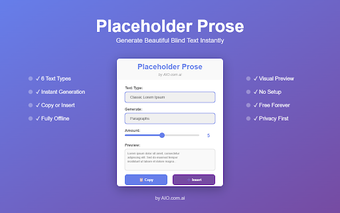 نص العنصر النائب هو مولد نصوص عمياء متعدد الاستخدامات مصمم لمطوري الويب والمصممين ومنشئي المحتوى. يتيح هذا الملحق في Chrome للمستخدمين إنشاء أنواع مختلفة من نصوص العنصر النائب بما في ذلك Lorem Ipsum الكلاسيكي، وCicero Latin، وBacon Ipsum، وHipster Ipsum، وCorporate Speak، وTechnical Jargon. يتميز الأداة بواجهة بصرية بديهية تتيح للمستخدمين اختيار تنسيقات النص مثل الكلمات أو الجمل أو الفقرات بسهولة. إنها مفيدة بشكل خاص للنماذج، والاختبار، والنماذج الأولية السريعة، حيث توفر وسيلة فعالة لملء فجوات المحتوى دون عناء.